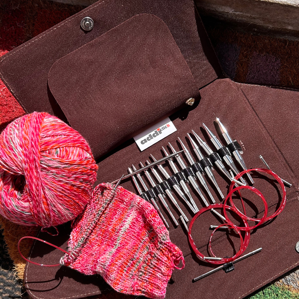 This set includes eight tip sizes, from 3.5mm to 8.0mm, covering most lace and accessory projects. With five addi cords ranging from 40cm to 100cm, there is plenty of flexibility for different styles of knitting. The connectors allow cords to be extended for larger pieces, and the addiClick system ensures that switching between tips and cords is quick, secure and snag-free.