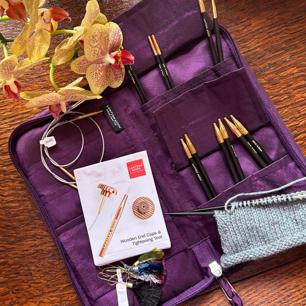 The attention to detail elevates the Bliss set. Wooden end caps and tightening tools add practicality, while the tassel stitch markers bring a cheerful touch. The embroidered khadi silk case keeps everything neatly organised and is machine-washable, a thoughtful feature that makes it both beautiful and durable. It slips easily into a project bag for use at home or on the go.