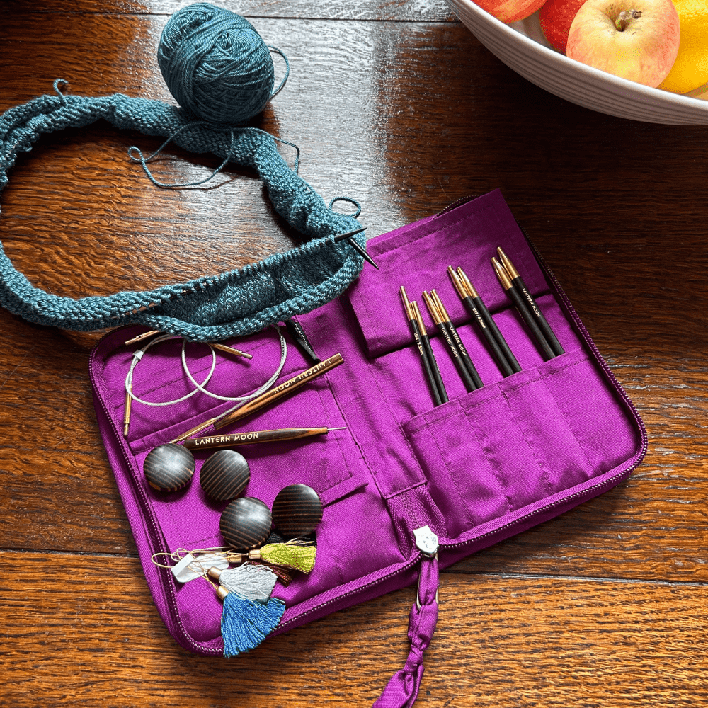 The Lantern Moon Grace set may be smaller than some of the other collections, but it is every bit as beautiful and thoughtfully designed. Opening the embroidered khadi silk case reveals five pairs of ebony tips polished to perfection. Refined, elegant and practical, it is a set for times when you do not need a huge range of needles but still want quality at your fingertips.