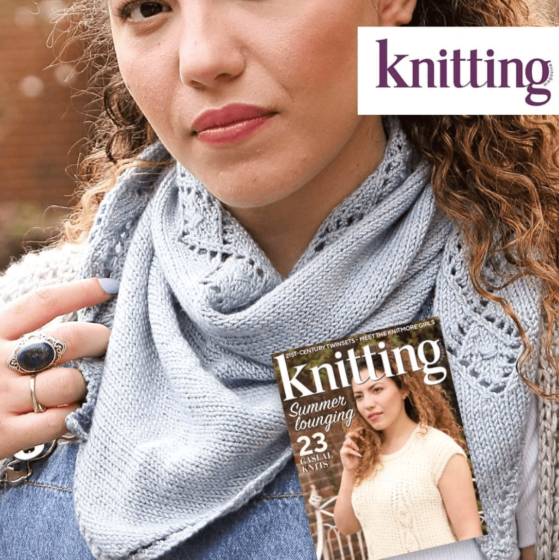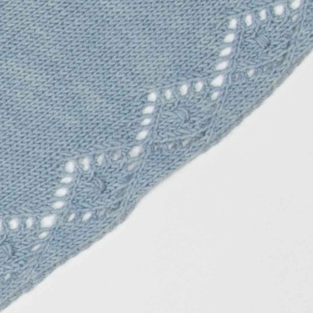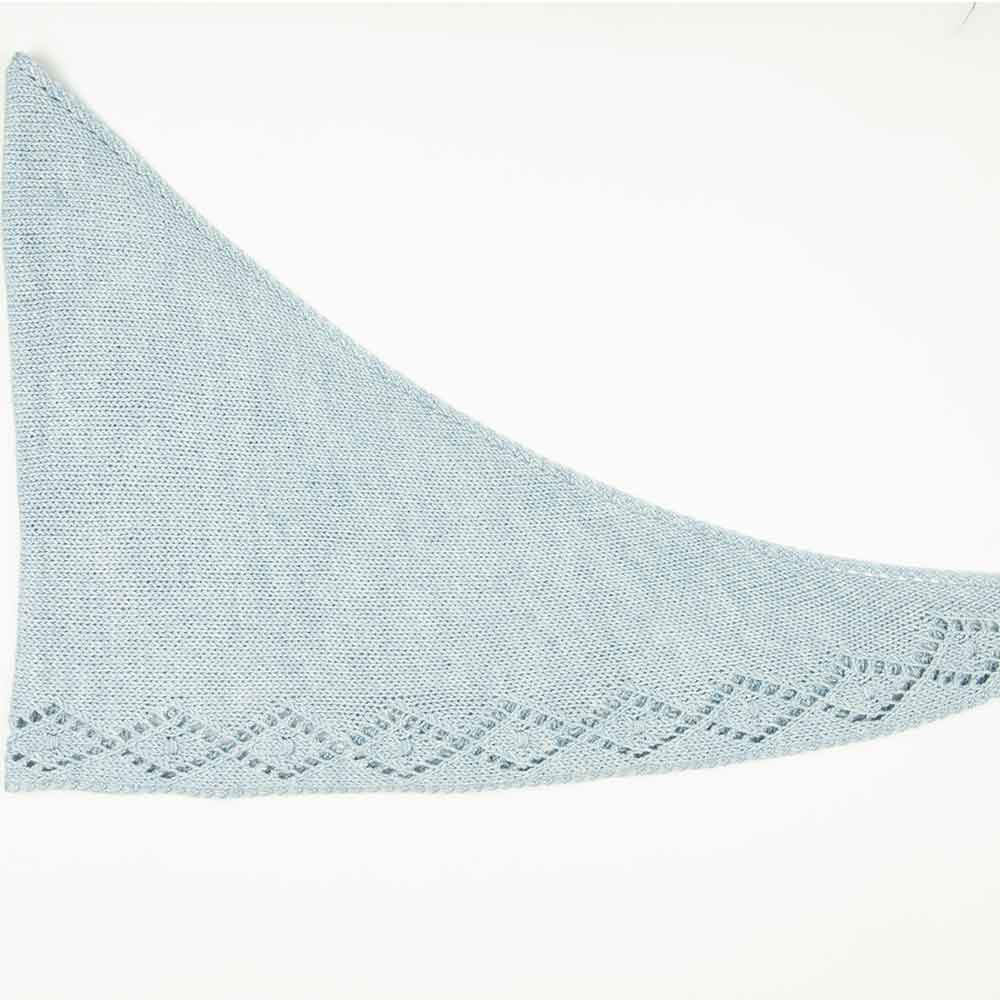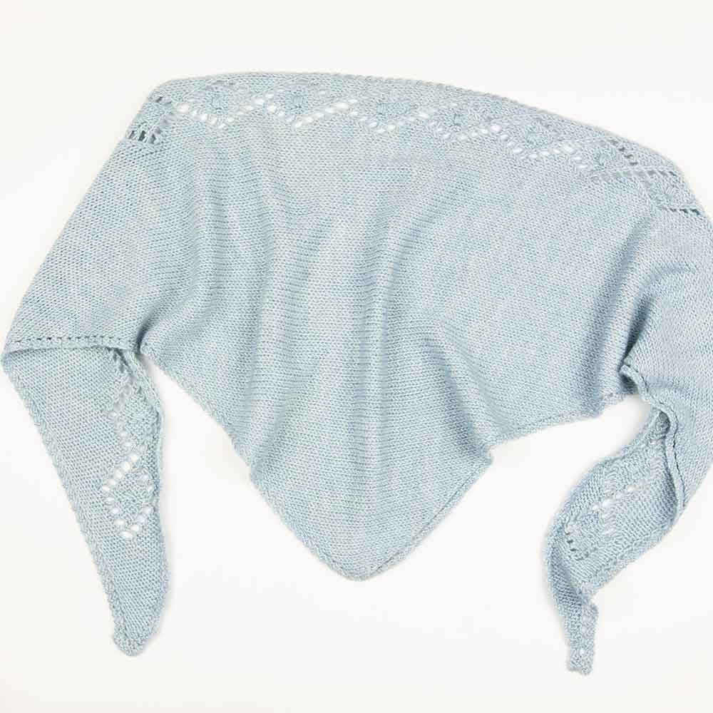 This kit contains pattern instructions to create a lightweight triangle with a narrow eyelet lace edge on two sides and a diamond stitch lace border along the remaining edge.